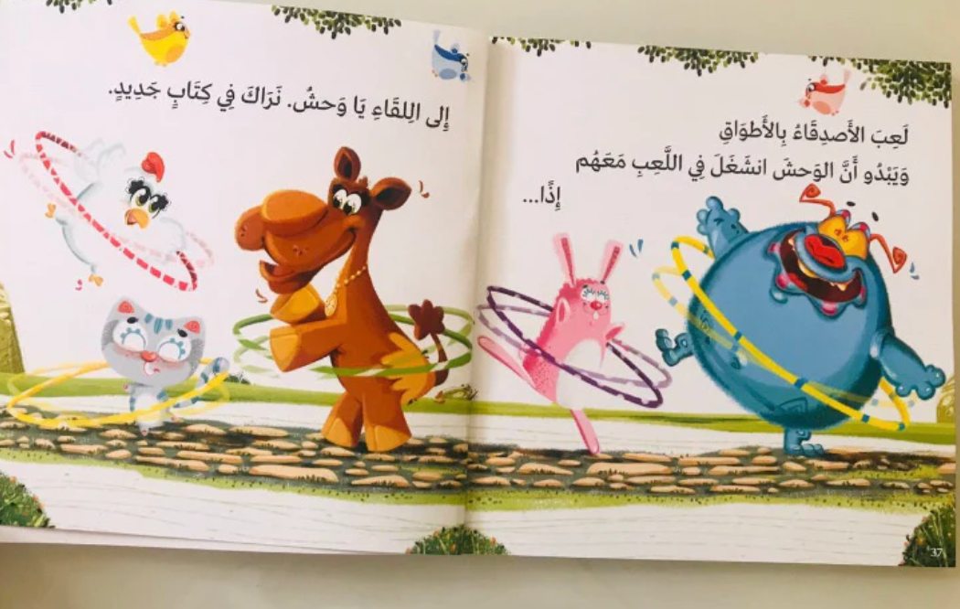 A monster who loves the Arabic letters so much. He eats various Arabic letters throughout the story. How can we tell which letter the monster ate? Simple! Point a flashlight to the monster’s belly from the back and light it up, the letter appears in the monster’s belly. This is the second of 3 books in this series.
