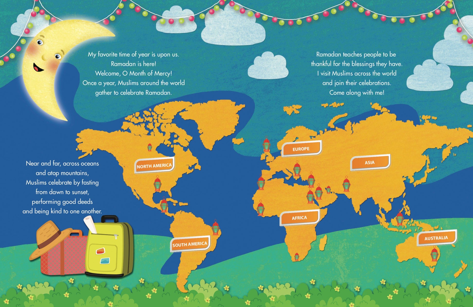 Join the Ramadan Moon as it travels the world to visit children and their families observing Ramadan. Ramadan Around The World showcases how various cultures celebrate the Islamic holiday. The purpose of this book is to illustrate the diversity of the global Muslim community. Children of various nationalities and abilities are represented throughout the book. Families of diverse sizes and demographics have also been equally represented. This book is an adventurous read for children and useful as an educational tool for educators.